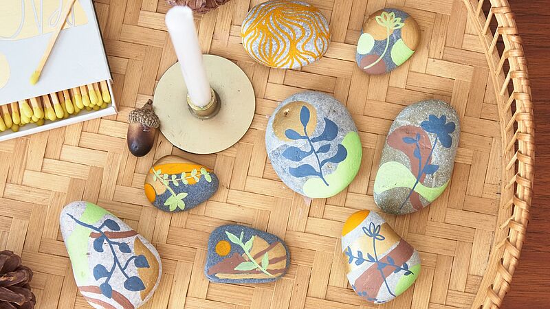You can easily paint branches with leaves, blossoms, or fruit onto stones. In our example, we first painted abstract shapes like circles and arcs onto the stone and then added plant motifs.