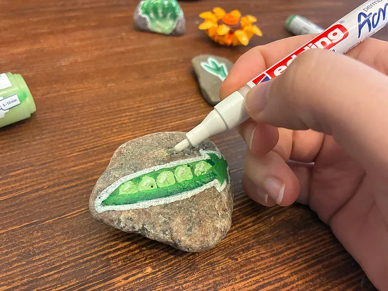 In this example, the light green peas are painted onto the darker green of the pod. The color gradient is achieved by blending the still-wet paint with a finger. The white outline makes the motif stand out nicely from the rest of the stone.